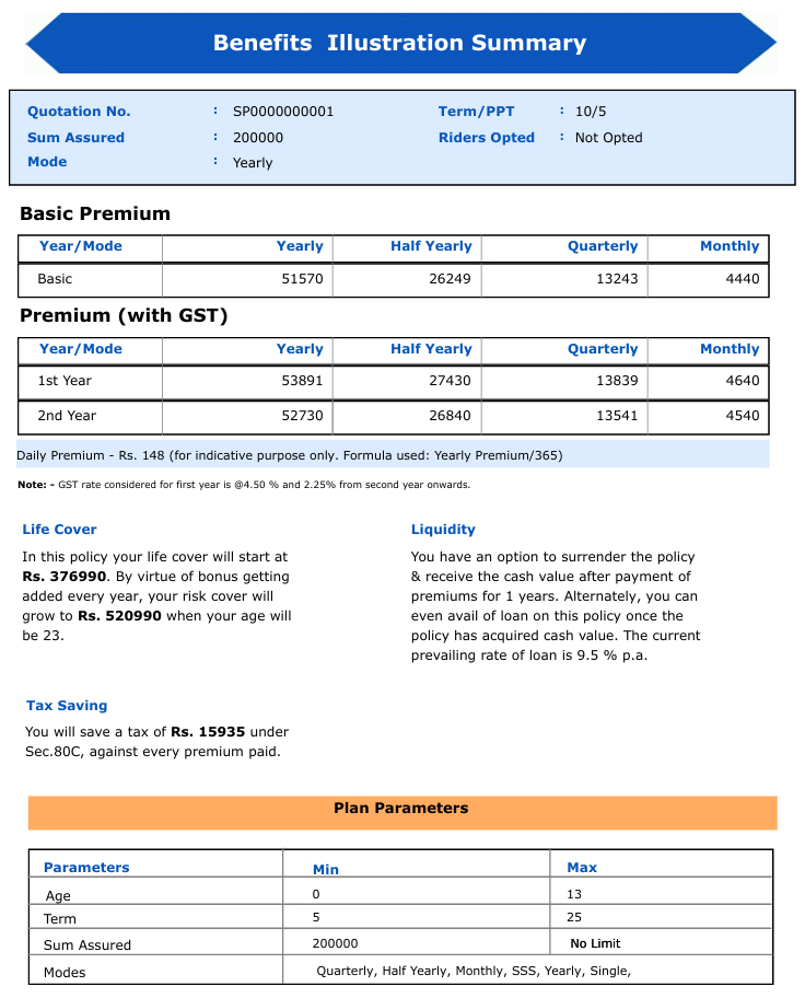 - Guaranteed Payouts: Maturity Benefit includes the Sum Assured on Maturity + Simple Reversionary Bonuses + Final Additional Bonus (if any). Death Benefit offers financial security to the nominee in case of premature demise.